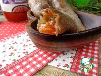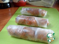 Лист рисовой бумаги опустить в воду на несколько секунд, воду стряхнуть. Лист выложить на полотенце или прямо на стол (мне так удобнее). На край выложить небольшое количество начинки... |