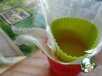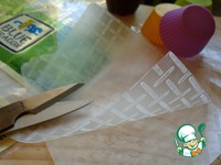 В формочку художественно укладываем бумагу, формируя корзинку, сверху фиксируем второй формочкой. Ставим в разогретую духовку (180 градусов) примерно на 5 минут.