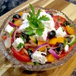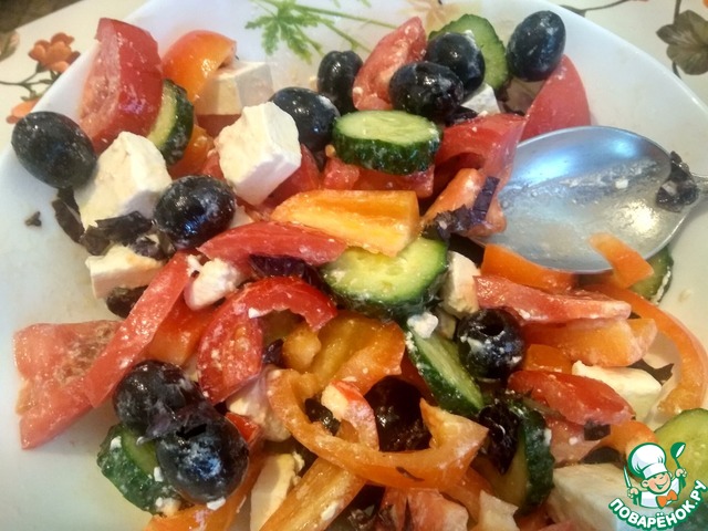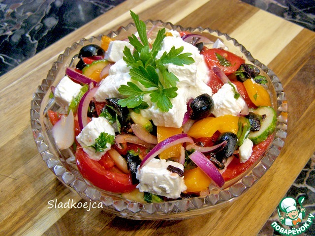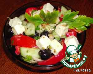 Сыр порезать кубиками с ребром примерно в 1-1,5 см. Если используется нежный сыр фетаки, то им лучше посыпать салат при подаче, не перемешивая. Украсить салат веточками зелени.