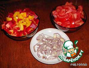 Лук порезать полукольцами, остальные овощи - кубиками (если планируется подавать салат в порционных салатниках) или дольками. Если используется зеленый салат - порвать его на мелкие кусочки. У помидоров желательно удалить семена.