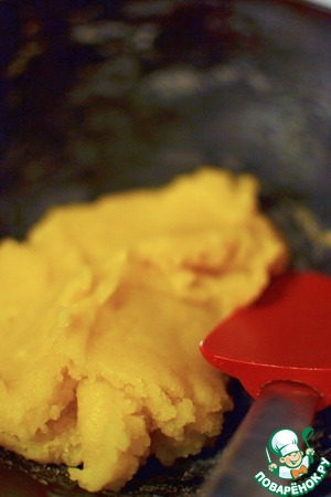 Всыпать в кипящую водно-масляную смесь сразу всю муку и убрать сотейник с огня. Быстро лопаткой замесить тесто.