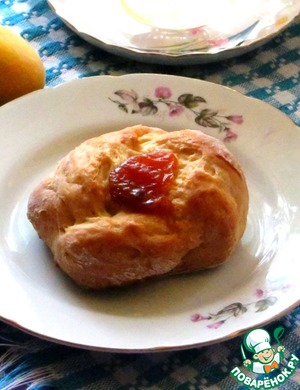 Теперь защипываем кончики должно получиться что-то вроде розочки, посередине с абрикоской. Так же я использовала дольки из варенья. Для таких булочек тесто просто сворачивала узлом и соединяла края теста. Сверху укладывала кусочек абрикоса.