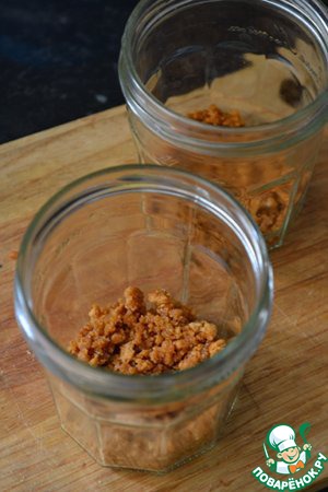 Подготовить 3 баночки объемом 200-250 мл. Заполнить их крошкой из печенья, хорошо утрамбовать.