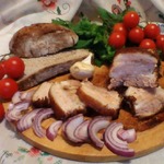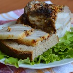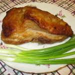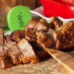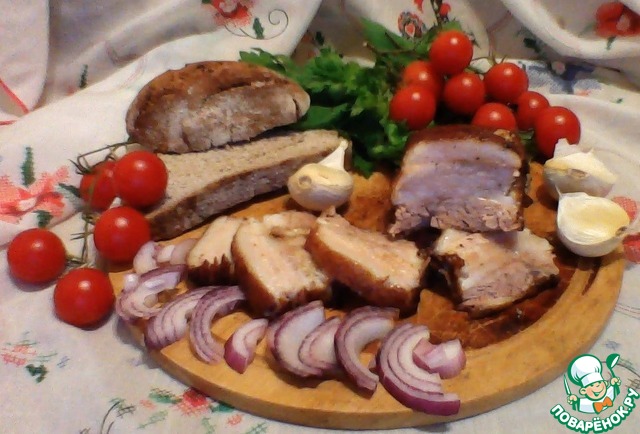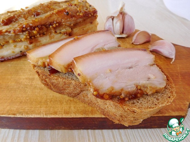 Грудинка шпигуется чесночком и соусом. Получается очень сочной и нежной. Как говорит моя тетя: "ХОТЬ ГУБАМИ ЕШЬ"