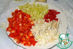 Все овощи помыть, лук и чеснок очистить. В этот раз у меня оказался великоват красный болгарский перчик, но это не страшно, так блюдо получилось даже наряднее. -
