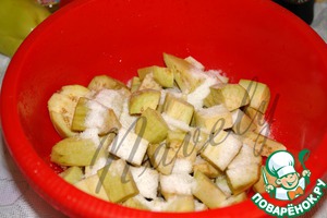 Баклажаны я очищаю, но это не обязательно. Нарезаем их довольно крупным кубиком, посыпаем солью (много) и оставляем на 20 минут для удаления горечи. Затем промываем и даем стечь воде.