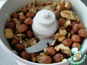 Орехи (у меня смешанные) подсушить немного на сухой сковороде. Измельчить очень мелко.