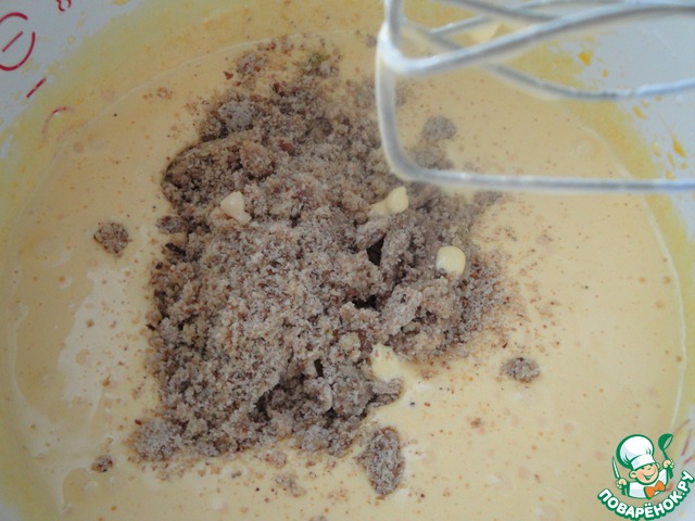 Желтки с сахаром также хорошо взбить до светлой кремовой массы. Добавьте молотые орехи и хорошо перемешайте.