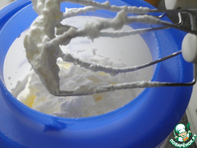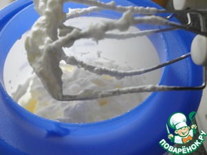 Затем постепенно добавляйте взбитые белки. Хорошо перемешивая лопаткой снизу вверх. Должно получиться очень воздушное тесто.