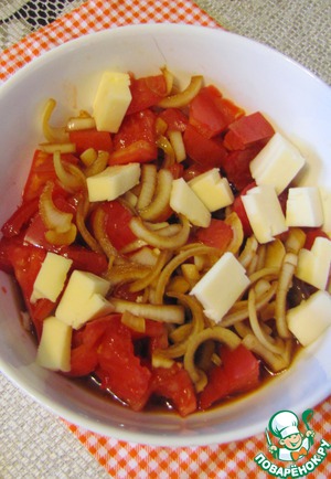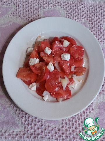К помидорам добавляем лук вместе с заправкой и брынзу.