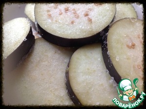 Первым делом нужно нарезать баклажан на кольца толщиной примерно 5 мм и пересыпать солью, чтобы ушла горечь, и оставить на 10 минут.