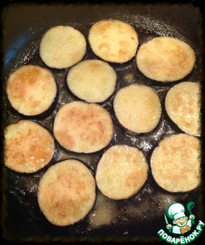 Баклажан промыть холодной водой, обсушить. Обвалять в муке с солью и обжарить на растительном масле до румяной корочки с двух сторон. -