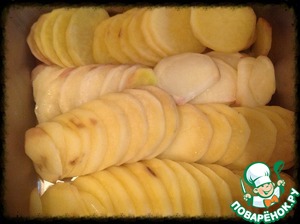 Картофель нарезать кольцами толщиной не более 3 мм, разложить веером на тарелке и запечь в микроволновке 6 минут (мощность 800 Wt).