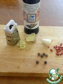 Смешать соевый соус, имбирь, тертый на терке, чеснок, пропущенный через пресс, душистый перец и розовый перец (предварительно перемолотые)