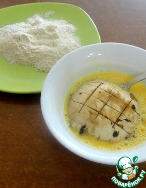 Опустить шляпки грибов в яичную смесь, затем в муку. -
