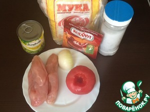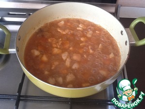 Разрубить курицу на порционные куски и поджарить на жиру. Вместе с мясом поджарить мелко нарезанный лук, муку и очищенные и нарезанные помидоры (от кожуры я не чистила). Затем положить красный перец, соль и влить горячую воду (чтобы она покрывала мясо).