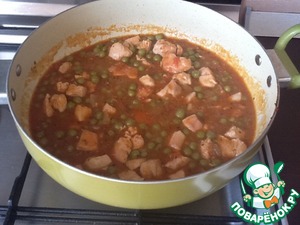 Когда смесь закипит, добавить очищенный свежий зеленый горошек и тушить до загустения. Перед тем как снять с огня, посыпать блюдо мелко нарезанным укропом.