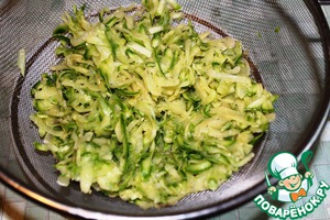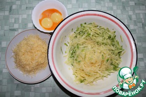 Очищенные картофель и кабачок натираю на крупной терке (кабачок только что с грядки, можно сказать молочной спелости, я его решила не чистить), солю и оставляю постоять. Натираю сыр на средней терке, отделяю желтки от белков. -