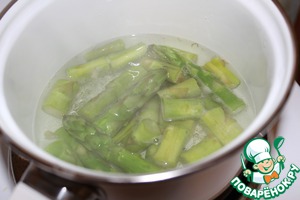 Чищу спаржу, т. е. обрезаю нижнюю жесткую часть, оставляю верхушки длиной приблизительно см 5-6 (они будут украшением), остальное нарезаю на куски по 2 см. Припускаю в подсоленой воде 5-8 минут.