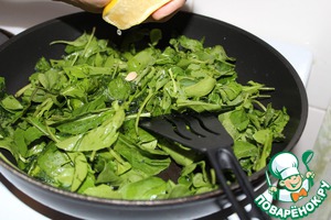 Шпинат промываю, обсушиваю на полотенце, обжариваю на масле с перцем, солью и лимонным соком (это привлеченный к процессу муж старается).