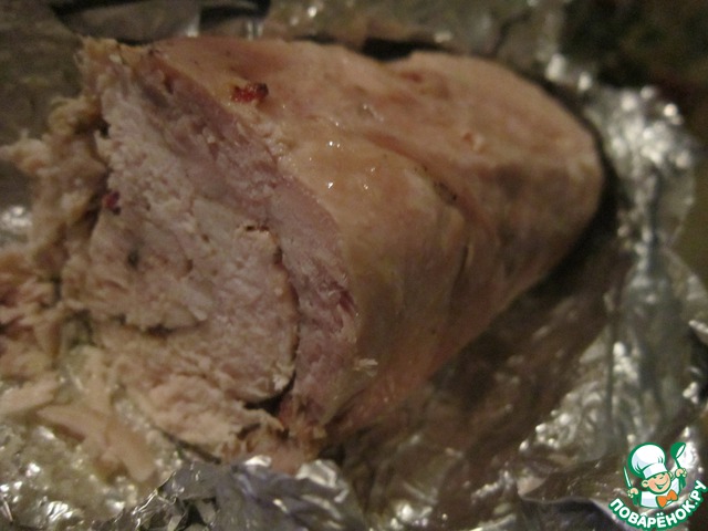 Далее не вынимания из фольги, оставить в холодильнике на несколько часов. Убрав нитки, развернуть, нарезать и можно подавать.