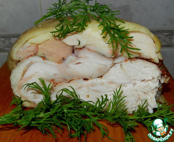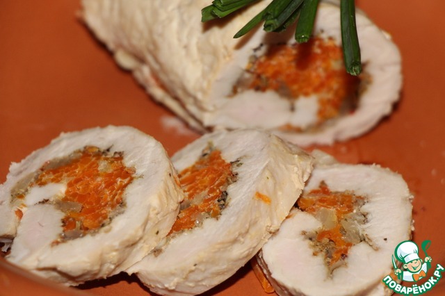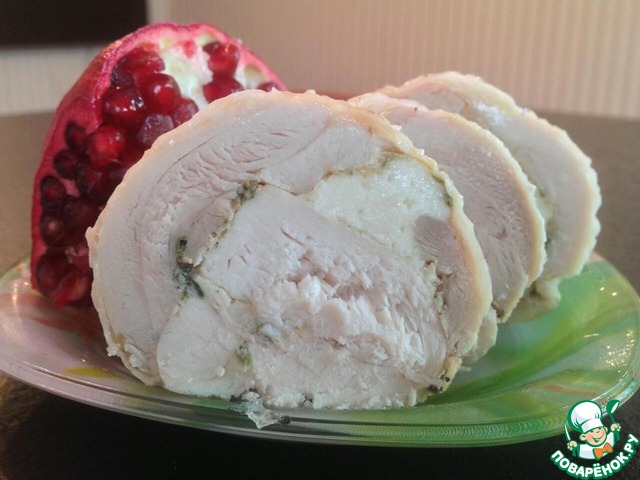 Перемещаем пласт мяса с кожицей на фольгу, сверху кладем кусочек филе и посыпаем мелконарезанной зеленью и чесноком. Заворачиваем все рулетом.