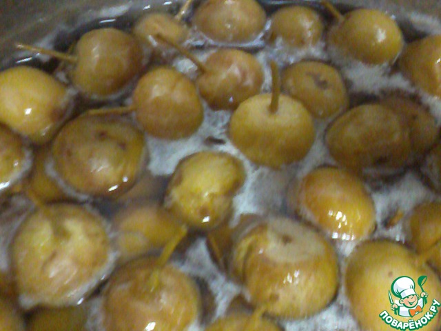 Приготовить сироп:залить сахар водой, прокипятить. Когда сахар растворился, добавить приготовленные грушки. Прокипятить 10-15 минут и отставить до утра.