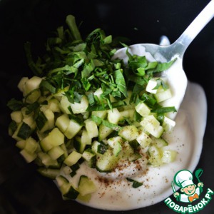 Огурец режем мелкими кубиками. В мисочке смешиваем творог, огурец, нарезанную зелень (вкуснее всего укроп), перчим, чууууточку присаливаем. Это будет соус.