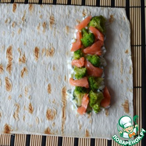 Брокколи остужаем и нарезаем кусочками. От листа лаваша отрезаем 1/3, раскладываем на доске или на столе.