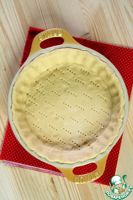 • За тем тесто раскатываем и укладываем в форму (у меня 24 см), накалываем вилкой, после чего выпекаем минут 15-20 при 200 градусах без груза. Если дно немного вздулось - не страшно, его легко потом можно прижать рукой.