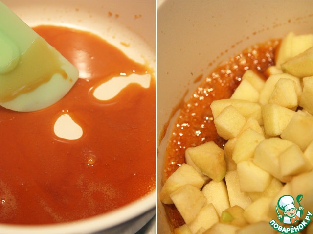 • Сахар высыпаем в сковороду и на среднем огне превращаем в карамель, добавляем немного воды и нарезанные яблоки.