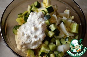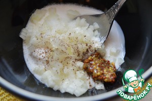 Пока все варится, делаем соус - смешиваем йогурт, горчицу, лук, соль и перец.