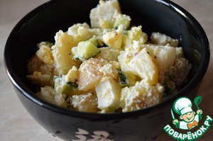 Готовую картошку еще горячей разрезаем пополам, а затем каждую половинку на 2-4 части, в зависимости от размера. Быстренько, пока все не остыло, режем яйца и огурец небольшими кубиками.