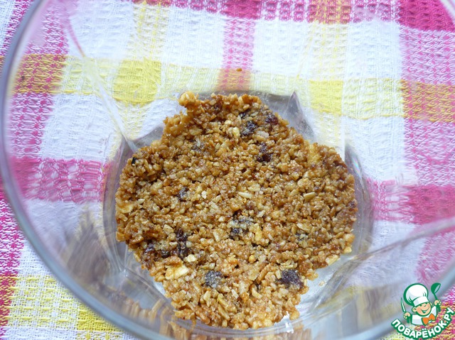 Мюсли, муку и сливочное масло взбить блендером в крошку. Выложить в стаканы и утрамбовать. |