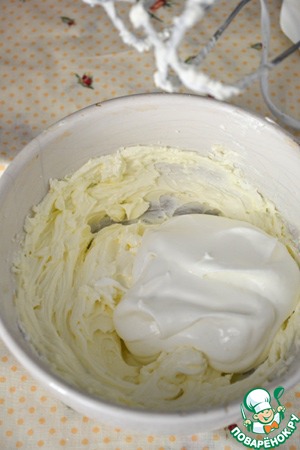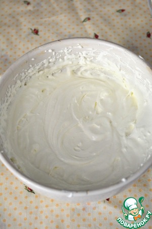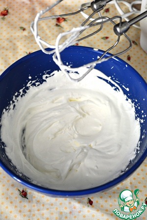В отдельной посуде взбить сливочный сыр до мягкости, добавить 30 г сахара, взбить до растворения сахара. Затем аккуратно ввести взбитые сливки.