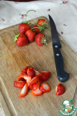 Пока охлаждается крем, подготовим соус. Для этого клубнику очистить, нарезать на небольшие кусочки.