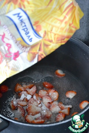 В кастрюлю кладем клубнику, добавляем воду, 1 ч. л. сахара и крахмал. Можно взять картофельный крахмал. Варить минуты 3-4, до мягкости ягод. При желании можно слегка размять ягоды. Охладить.