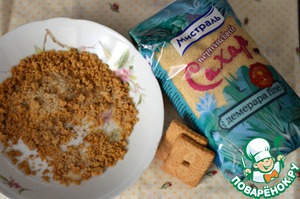 Теперь слой печенья: измельчить его до крошки, добавить 1 ч. л. коричневого сахара и щепотку корицы. Размешать.
