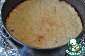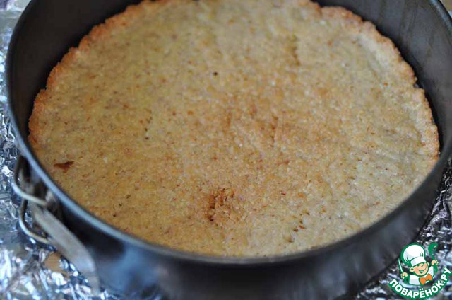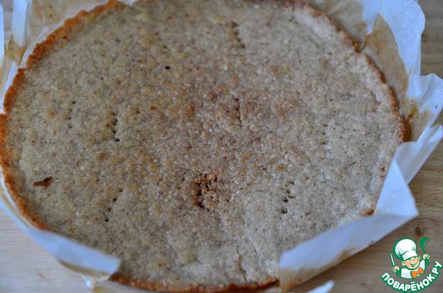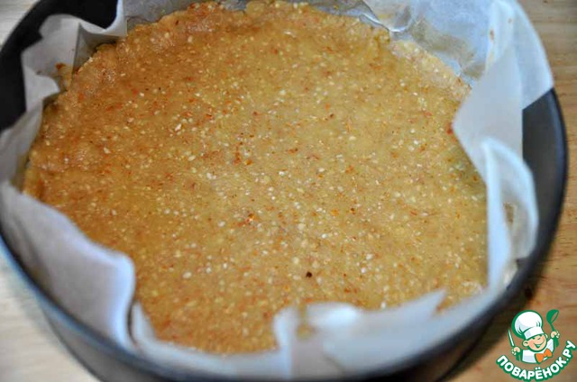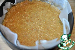 Берём разъёмную форму, прокладываем дно бумагой для выпечки, выкладываем тесто, разравниваем его рукою по всему дну. Накалываем вилкой.