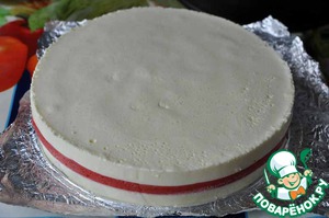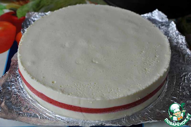 Достаём из холодильника застывший десерт, заливаем сливочно-желейной массой, ставим в холодильник для полного застывания на 2-3 часа.
