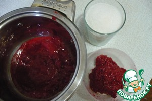 В пюре добавить сахар и уварить до густоты. Так как мы вылили сок в желатин, то на это у меня ушло 5 мин.