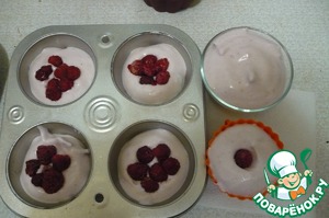 Разложить желейную массу по формочкам на 1/2. Положить свежую малину и заполнить до верху. Украсить малиной.