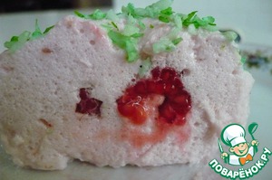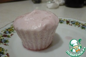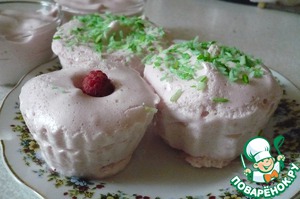 Охлажденные белки взбить в крепкую пену, добавить малиновое пюре, сок лимона и продолжая взбивать, влить желатин. Взбивать еще 3-5 мин., до образования пышной массы.