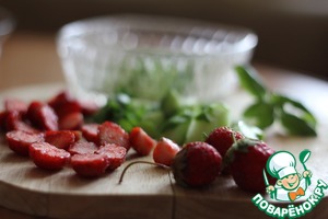 Клубнику нарезать мелкими кубиками. Огурец можно очистить, если кожица грубая, нарезать такими же кубиками как и клубнику. Нарезать мелко базилик, шнитт- лук, сельдерей.