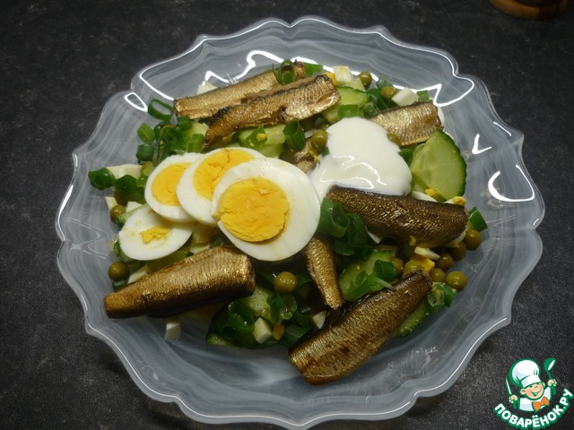 Нарезать кубиками огурцы, яйца, зеленый лук нарезать тонкими колечками, поломать шпроты на кусочки, добавить горошек или кукурузу(можно и то и другое вместе, кто как любит), немного можно подсолить, заправить майонезом. Тем кто любит посытнее предлагаю в салат добавить немного масла со шпротов. Перемешать все и салат готов. Если получилось много салата, можно часть заправить майонезом, а остальную часть поставить в холодильник и заправлять перед подачей на стол, так как он может хранится несколько дней.