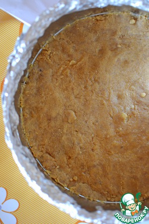 Печенье измельчить до состояния мелкой крошки, смешать с размягчённым сливочным маслом и выложить массу на дно формы, тщательно утрамбовывая. Убрать форму с основой в холодильник.