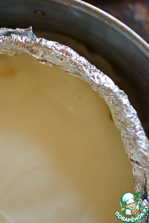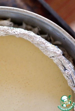 Форму для выпечки (разъёмную, 20 - 22 см в диаметре) необходимо подготовить. Я сначала застилаю дно бумагой для выпечки и только потом "застёгиваю" вокруг него кольцо боковины. Бортики изнутри тщательно смазать маслом. Снаружи форму тщательно закутать в два слоя фольги.