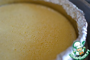 Поставить форму с основой в посуду для водяной бани, залить сырную массу и аккуратно между бортиков влить кипяток на половину высоты формы с чизкейком. Выпекать 50 минут при 180 ° С. на средней полке духовки.