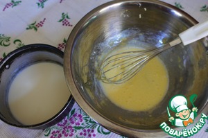 Готовим заварной крем: тщательно растираем желток, 50 гр сахара, 10 гр муки и 1 гр ванилина, смесь немного белеет. Доводим 135 мл молока до кипения, тонкой струйкой вливаем немного молока в желточную смесь, перемешиваем, и соединяем с молоком полностью.