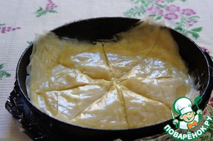 У меня нет малой прямоугольной формы, поэтому я делила каждый лист фило на 4 части, в итоге у меня вышло 20 квадратов. Необходимо промазать форму маслом, и выкладывать половину листов (в моем случае 10 квадратов) друг на друга, поверхность каждого из которых промазывая растопленным сливочным маслом. Не пропускайте уголки листов. -